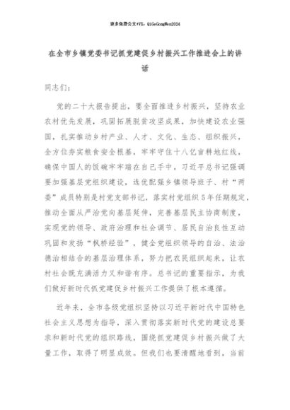 【七哥公文】2024年:在全市乡镇党委书记抓党建促乡村振兴工作推进会上的讲话+更多免费公文+VX:QiGeGongWen2024