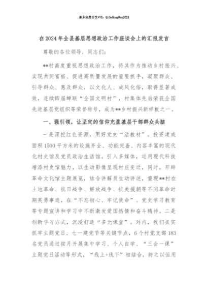 【七哥公文】2024年:在2024年全县基层思想政治工作座谈会上的汇报发言+更多免费公文+VX:QiGeGongWen2024