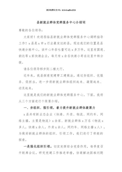/ 【七哥公文】2024年:县新就业群体党群服务中心介绍词+更多免费公文+VX:QiGeGongWen2024