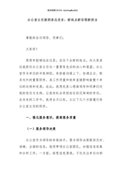 / 【七哥公文】2024年:办公室主任就职表态发言:新起点新征程新担当+更多免费公文+VX:QiGeGongWen2024