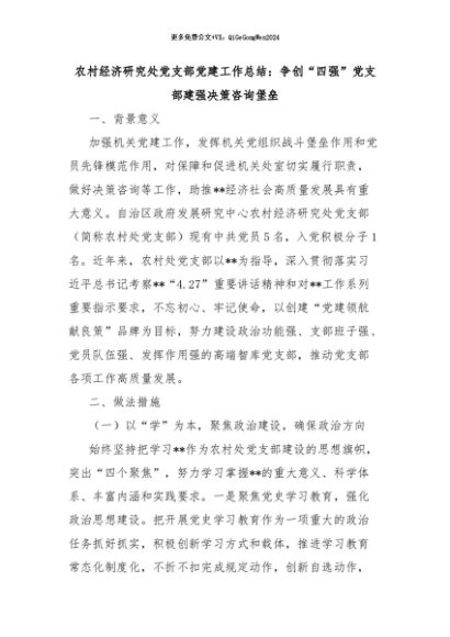 【七哥公文】2024年:农村经济研究处党支部党建工作总结:争创“四强”党支部建强决策咨询堡垒+更多免费公文+VX:QiGeGongWen2024