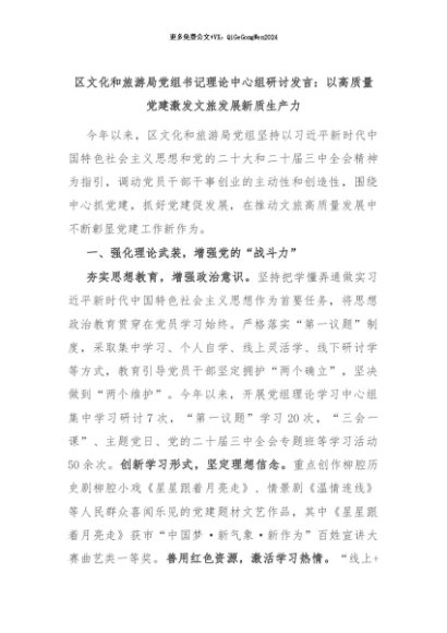【七哥公文】2024年:区文化和旅游局党组书记理论中心组研讨发言:以高质量党建激发文旅发展新质生产力+更多免费公文+VX:QiGeGongWen2024