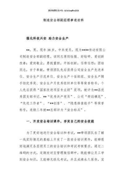 / 【七哥公文】2024年:制造安全部副经理事迹材料+更多免费公文+VX:QiGeGongWen2024