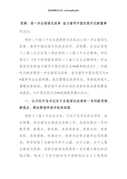 【七哥公文】2024年:党课:进一步全面深化改革 奋力谱写中国式现代化新篇章+更多免费公文+VX:QiGeGongWen2024