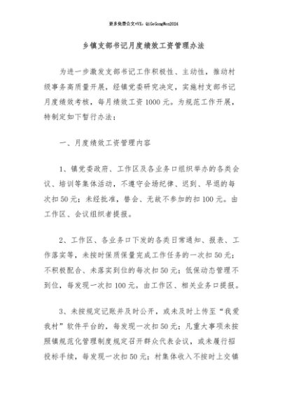 / 【七哥公文】2024年:乡镇支部书记月度绩效工资管理办法+更多免费公文+VX:QiGeGongWen2024