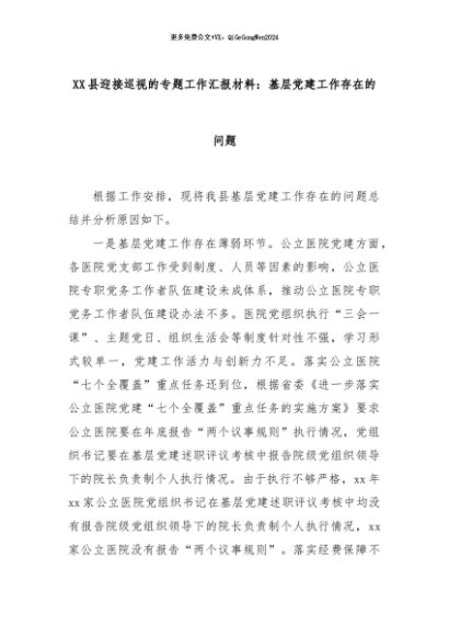【七哥公文】2024年:XX县迎接巡视的专题工作汇报材料:基层党建工作存在的问题+更多免费公文+VX:QiGeGongWen2024