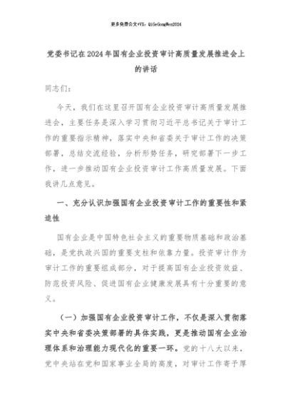 【七哥公文】2024年:党委书记在2024年国有企业投资审计高质量发展推进会上的讲话+更多免费公文+VX:QiGeGongWen2024
