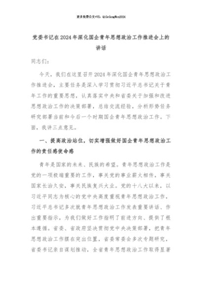 【七哥公文】2024年:党委书记在2024年深化国企青年思想政治工作推进会上的讲话+更多免费公文+VX:QiGeGongWen2024