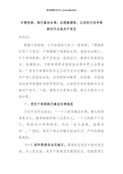 【七哥公文】2024年:专题党课:践行廉洁自律,杜绝微腐败,以实际行动争做新时代合格共产党员+更多免费公文+VX:QiGeGongWen2024