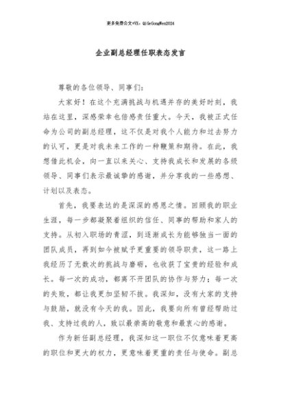 / 【七哥公文】2024年:企业副总经理任职表态发言+更多免费公文+VX:QiGeGongWen2024