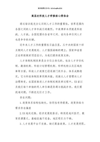 【七哥公文】2024年:高层次科技人才研修班心得体会+更多免费公文+VX:QiGeGongWen2024