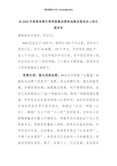 【七哥公文】2024年:在2024年街道党建引领网格微治理阵地建设推进会上的汇报发言+更多免费公文+VX:QiGeGongWen2024