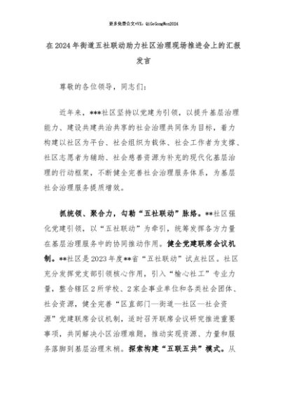 【七哥公文】2024年:在2024年街道五社联动助力社区治理现场推进会上的汇报发言+更多免费公文+VX:QiGeGongWen2024