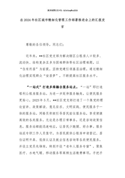 【七哥公文】2024年:在2024年社区城市精细化管理工作部署推进会上的汇报发言+更多免费公文+VX:QiGeGongWen2024