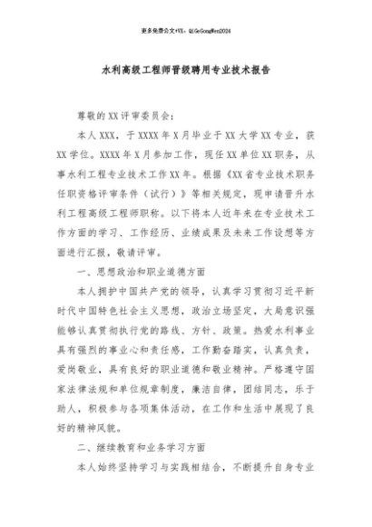 / 【七哥公文】2024年:水利高级工程师晋级聘用专业技术报告+更多免费公文+VX:QiGeGongWen2024