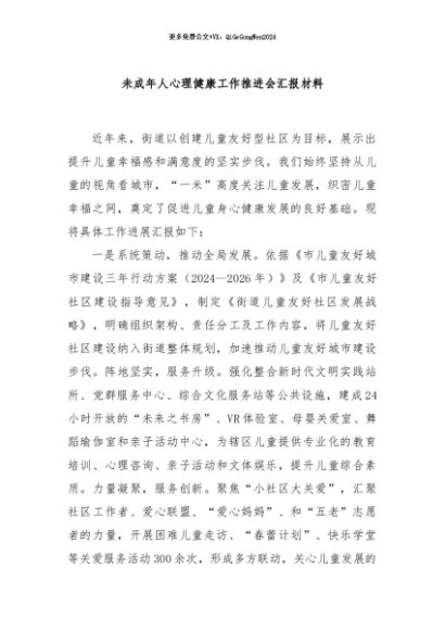 / 【七哥公文】2024年:未成年人心理健康工作推进会汇报材料+更多免费公文+VX:QiGeGongWen2024