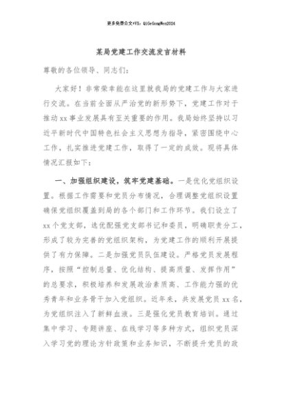 / 【七哥公文】2024年:某局党建工作交流发言材料+更多免费公文+VX:QiGeGongWen2024