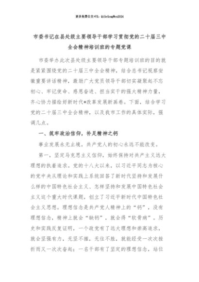 【七哥公文】2024年:市委书记在县处级主要领导干部学习贯彻党的二十届三中全会精神培训班的专题党课+更多免费公文+VX:QiGeGongWen2024