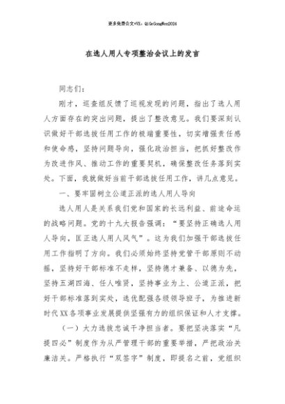 【七哥公文】2024年:在选人用人专项整治会议上的发言+更多免费公文+VX:QiGeGongWen2024