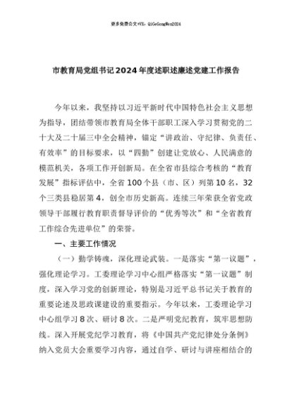 【七哥公文】2024年:市教育局党组书记2024年度述职述廉述党建工作报告+更多免费公文+VX:QiGeGongWen2024