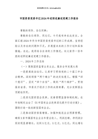 / 【七哥公文】2024年:市国资委党委书记2024年述职述廉述党建工作报告+更多免费公文+VX:QiGeGongWen2024