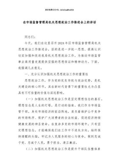 / 【七哥公文】2024年:在市场监督管理局机关思想政治工作推进会上的讲话+更多免费公文+VX:QiGeGongWen2024