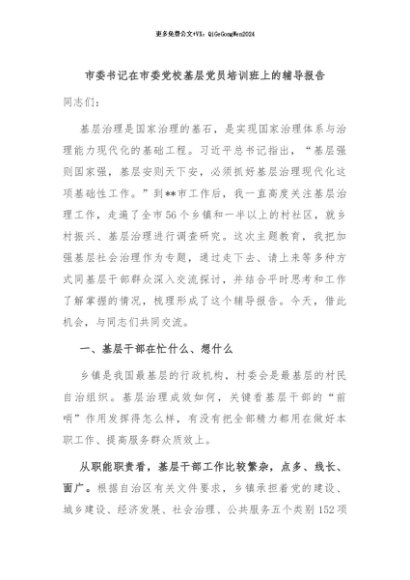 / 【七哥公文】2024年:市委书记在市委党校基层党员培训班上的辅导报告+更多免费公文+VX:QiGeGongWen2024