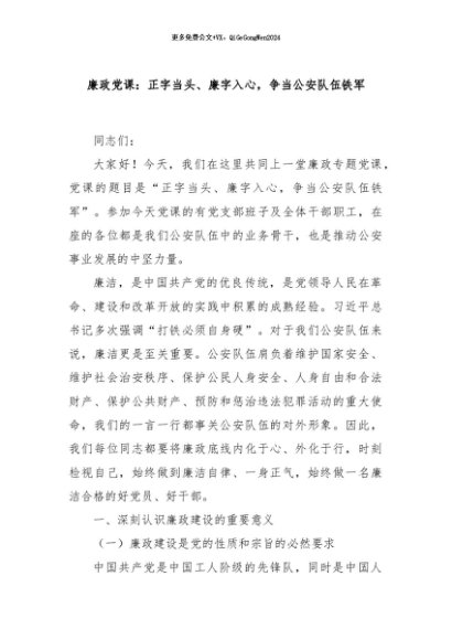 【七哥公文】2024年:廉政党课:正字当头、廉字入心,争当公安队伍铁军 (1)+更多免费公文+VX:QiGeGongWen2024
