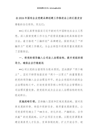 【七哥公文】2024年:在2024年国有企业党建品牌创建工作推进会上的汇报发言+更多免费公文+VX:QiGeGongWen2024