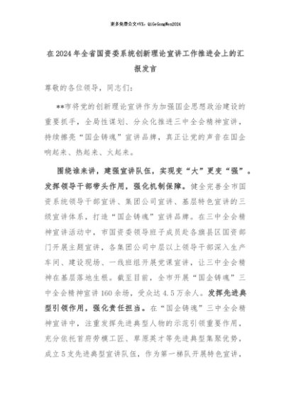 【七哥公文】2024年:在2024年全省国资委系统创新理论宣讲工作推进会上的汇报发言+更多免费公文+VX:QiGeGongWen2024