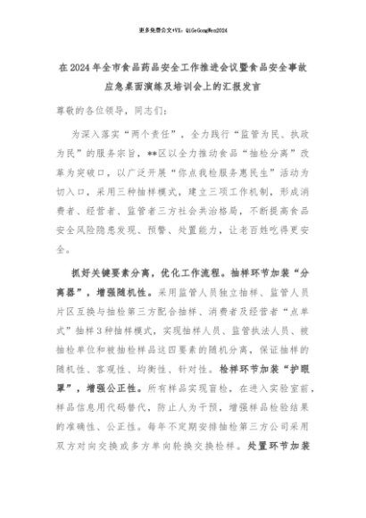 【七哥公文】2024年:在2024年全市食品药品安全工作推进会议暨食品安全事故应急桌面演练及培训会上的汇报发言+更多免费公文+VX:QiGeGongWen2024