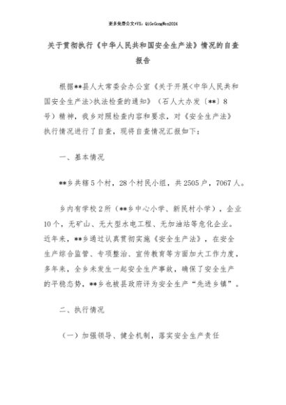 【七哥公文】2024年:关于贯彻执行《中华人民共和国安全生产法》情况的自查报告+更多免费公文+VX:QiGeGongWen2024
