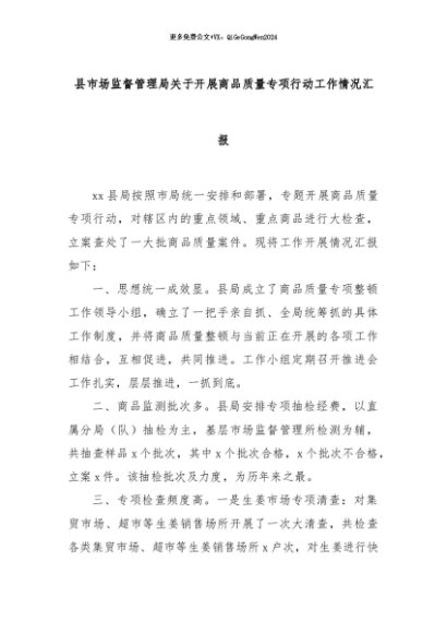 【七哥公文】2024年:县市场监督管理局关于开展商品质量专项行动工作情况汇报+更多免费公文+VX:QiGeGongWen2024