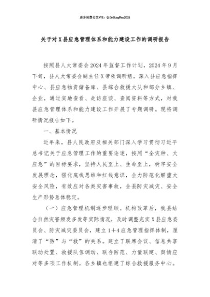 / 【七哥公文】2024年:关于对X县应急管理体系和能力建设工作的调研报告+更多免费公文+VX:QiGeGongWen2024