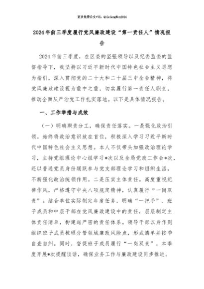 【七哥公文】2024年:2024年前三季度履行党风廉政建设“第一责任人”情况报告+更多免费公文+VX:QiGeGongWen2024