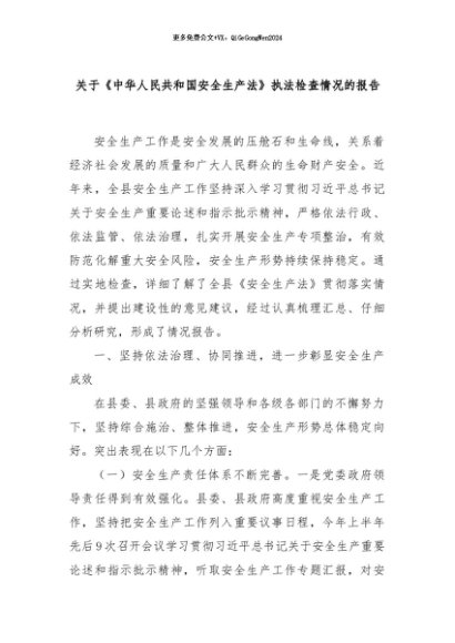 【七哥公文】2024年:关于《中华人民共和国安全生产法》执法检查情况的报告+更多免费公文+VX:QiGeGongWen2024