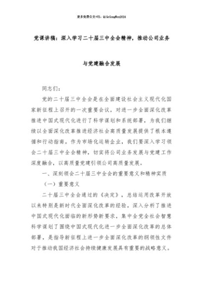 【七哥公文】2024年:党课讲稿:深入学习二十届三中全会精神,推动公司业务与党建融合发展+更多免费公文+VX:QiGeGongWen2024