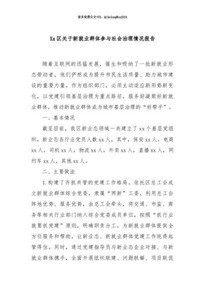 / 【七哥公文】2024年:Xx区关于新就业群体参与社会治理情况报告+更多免费公文+VX:QiGeGongWen2024