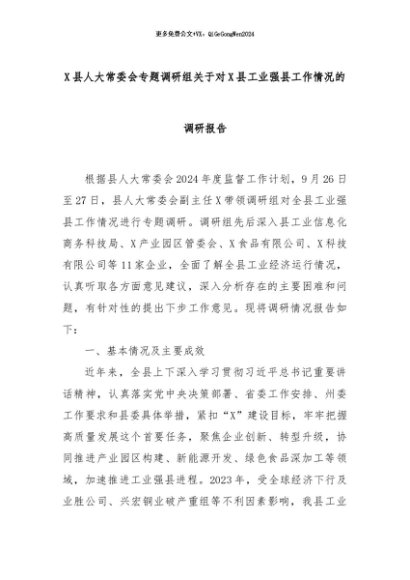 【七哥公文】2024年:X县人大常委会专题调研组关于对X县工业强县工作情况的调研报告+更多免费公文+VX:QiGeGongWen2024