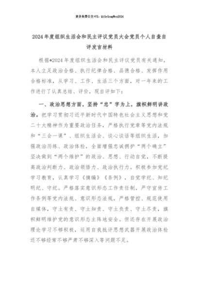 【七哥公文】2024年:2024年度组织生活会和民主评议党员大会党员个人自查自评发言材料+更多免费公文+VX:QiGeGongWen2024