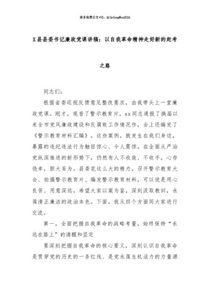 【七哥公文】2024年:Xx县县委书记廉政党课讲稿:以自我革命精神走好新的赶考之路+更多免费公文+VX:QiGeGongWen2024
