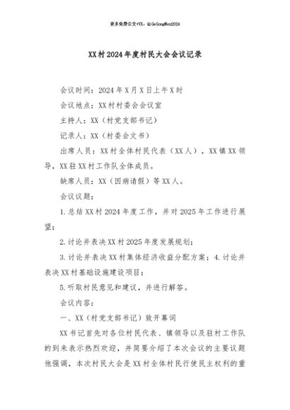 / 【七哥公文】2024年:XX村2024年度村民大会会议记录+更多免费公文+VX:QiGeGongWen2024