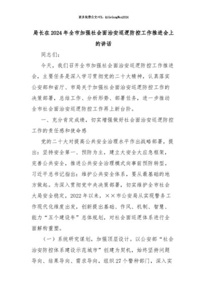 【七哥公文】2024年:局长在2024年全市加强社会面治安巡逻防控工作推进会上的讲话+更多免费公文+VX:QiGeGongWen2024