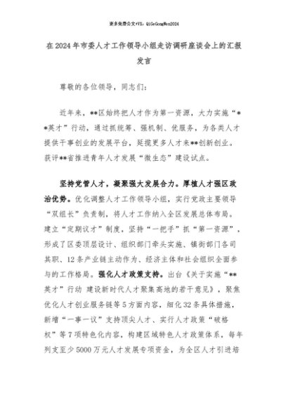 【七哥公文】2024年:在2024年市委人才工作领导小组走访调研座谈会上的汇报发言+更多免费公文+VX:QiGeGongWen2024