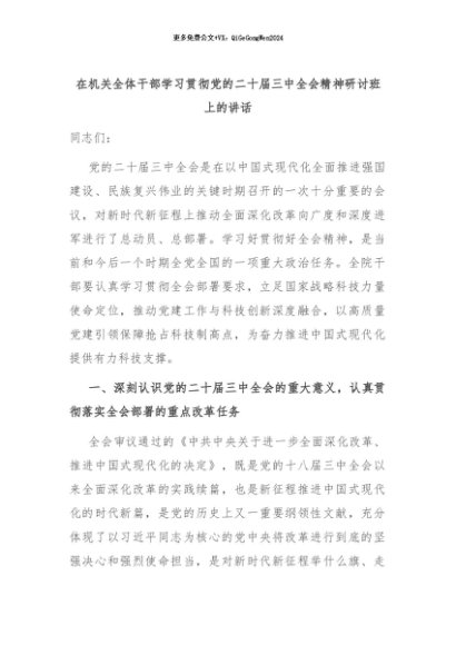 【七哥公文】2024年:在机关全体干部学习贯彻党的二十届三中全会精神研讨班上的讲话+更多免费公文+VX:QiGeGongWen2024
