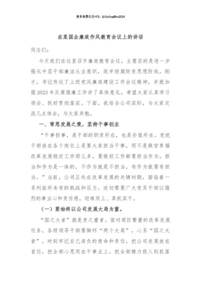 / 【七哥公文】2024年:在某国企廉政作风教育会议上的讲话+更多免费公文+VX:QiGeGongWen2024