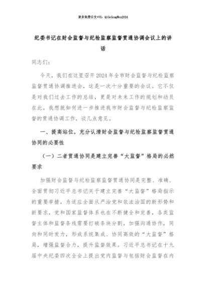 【七哥公文】2024年:纪委书记在财会监督与纪检监察监督贯通协调会议上的讲话+更多免费公文+VX:QiGeGongWen2024