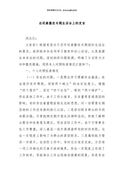 / 【七哥公文】2024年:在巡察整改专题生活会上的发言+更多免费公文+VX:QiGeGongWen2024