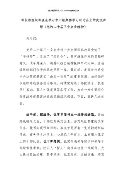 【七哥公文】2024年:部长在组织部理论学习中心组集体学习研讨会上的交流讲话(党的二十届三中全会精神)+更多免费公文+VX:QiGeGongWen2024