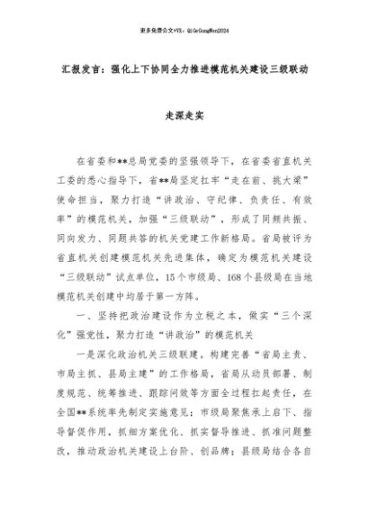 【七哥公文】2024年:汇报发言:强化上下协同全力推进模范机关建设三级联动走深走实+更多免费公文+VX:QiGeGongWen2024